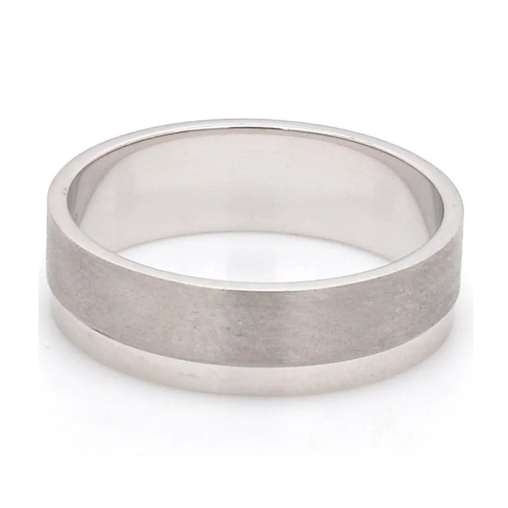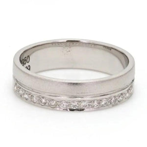 This beautiful pair of platinum wedding bands has a plain men's band & a similar diamond studded women's band. The Men's band has major matte finish with a region of hi-polish which is separated by a thin line. The women's band has the same design with diamonds studded in half eternity style in the hi-polish area.