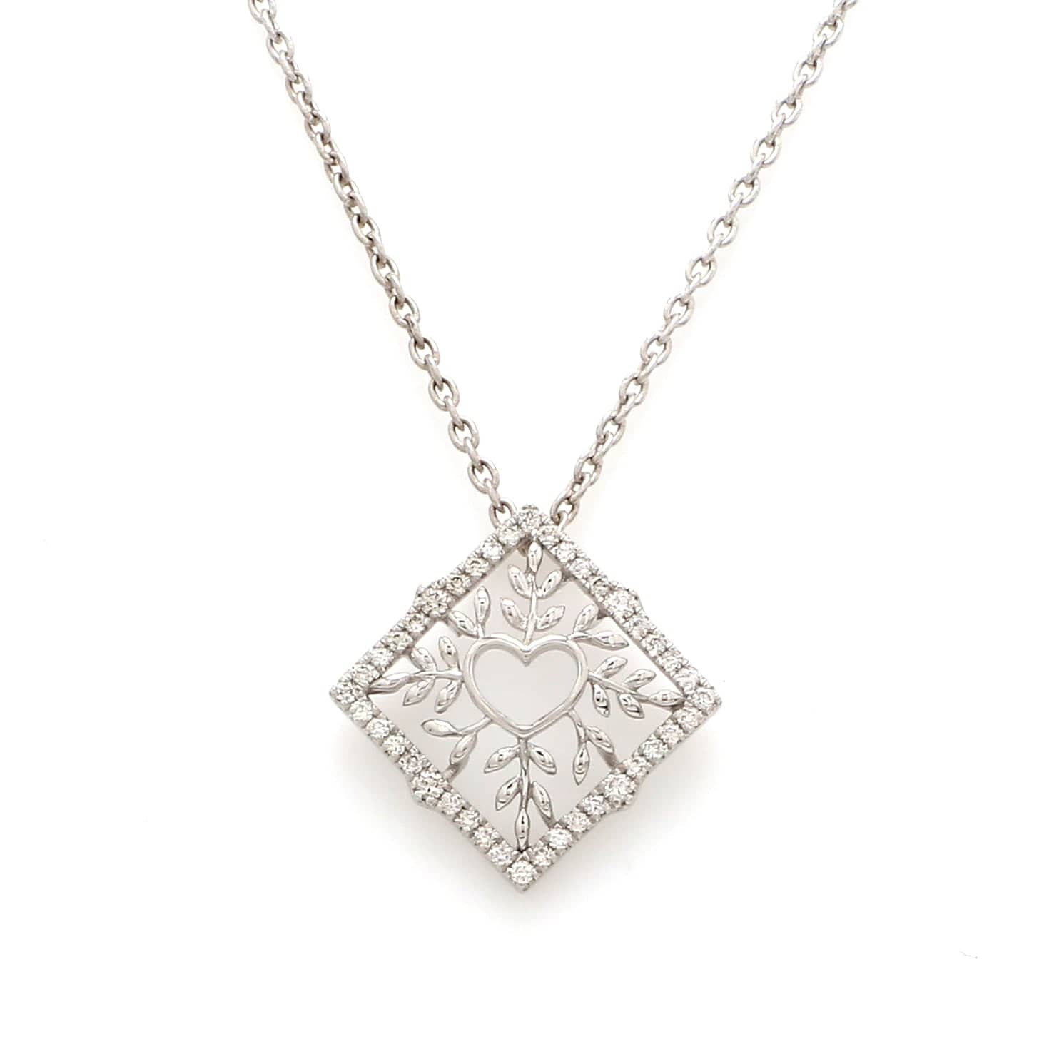 Beautiful platinum pendant with diamonds for women with a heart in the center. Crafted in Platinum. Hallmarked for Pt 950. Certified by PGI.