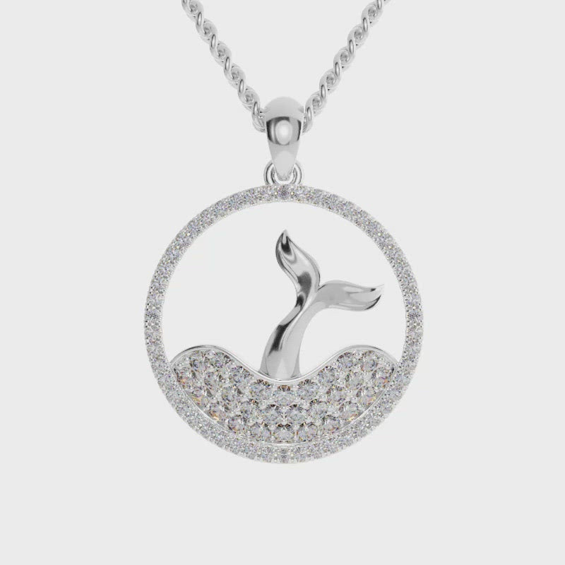 Platinum diamonds pendant for women designed as a dolphin's tail in a sea of diamonds.