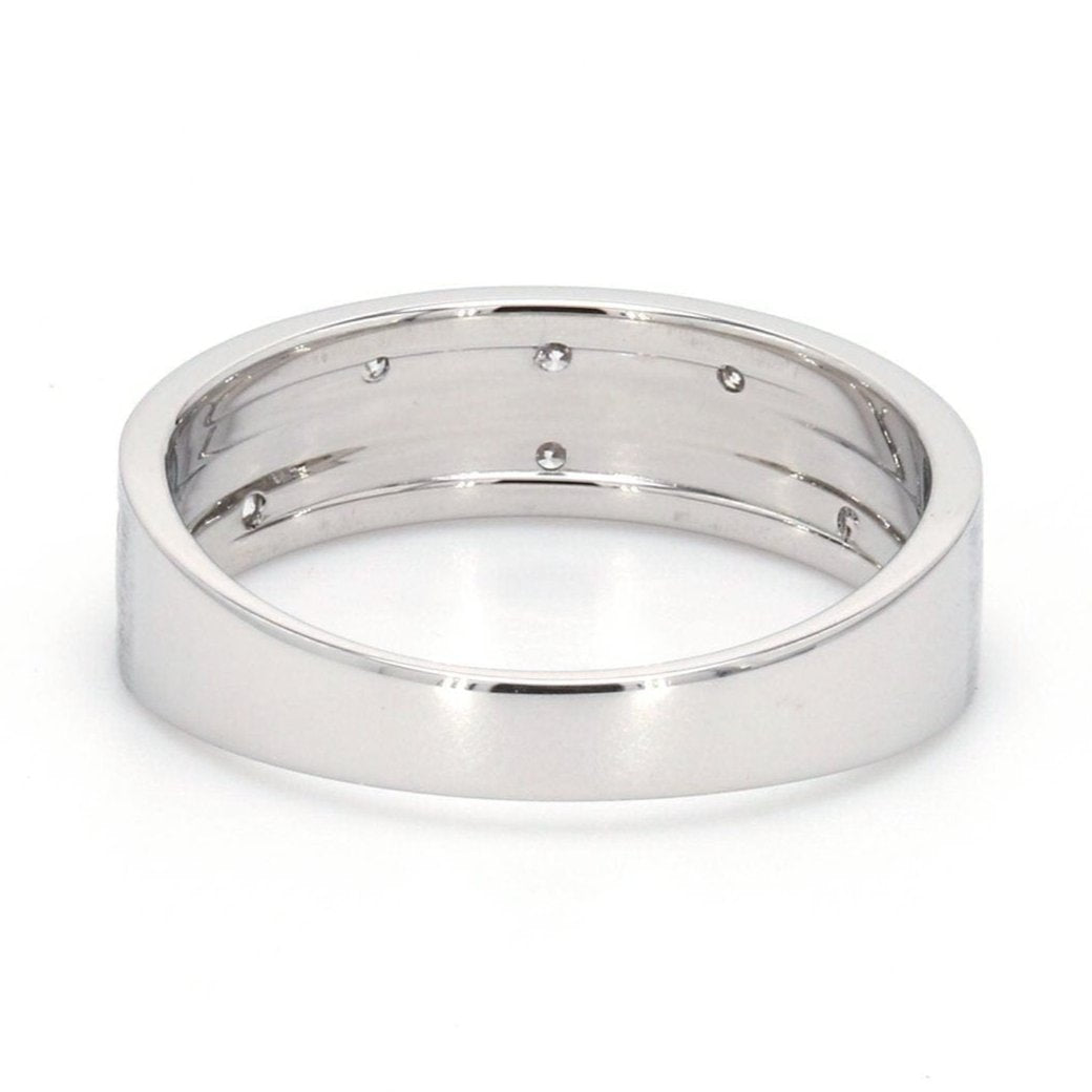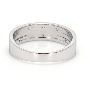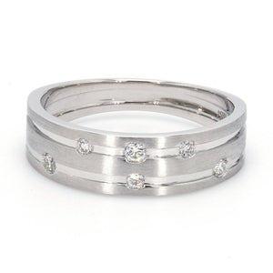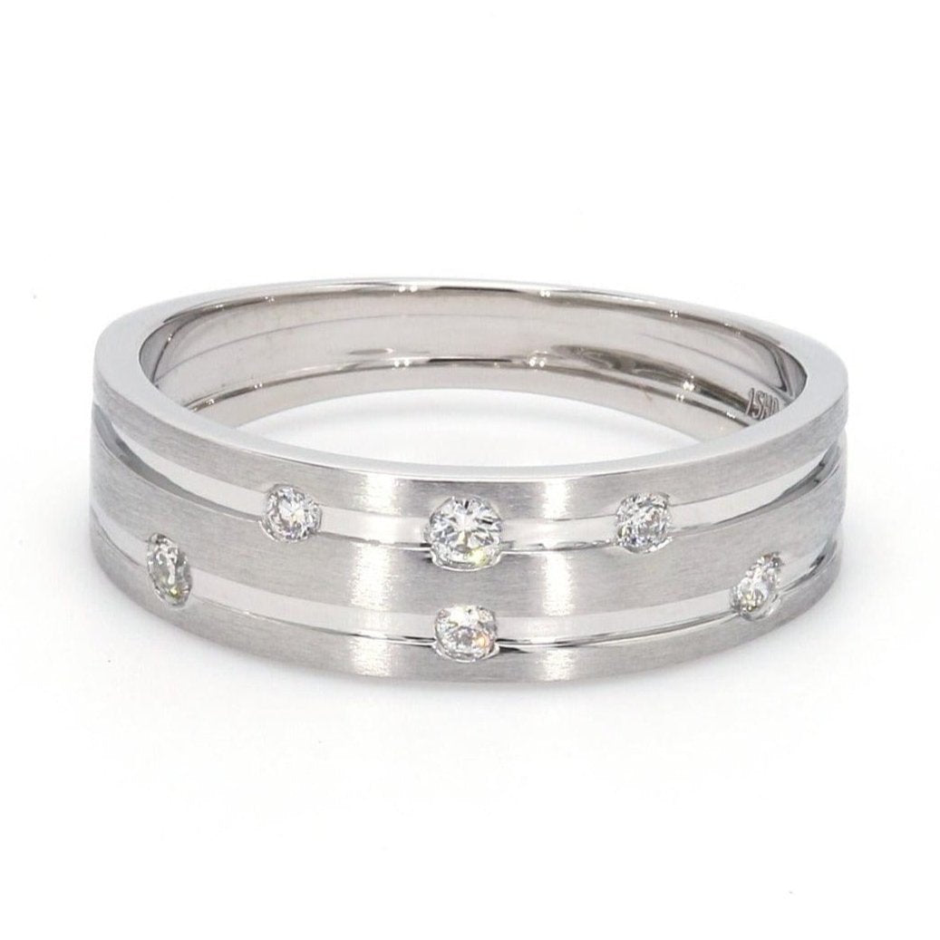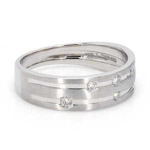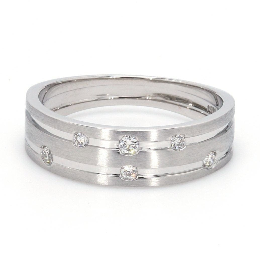 Designer platinum ring with 2 grooves & six diamonds set in the grooves.