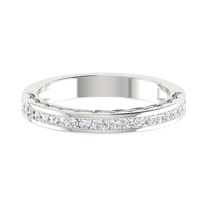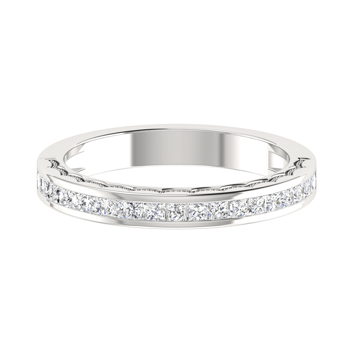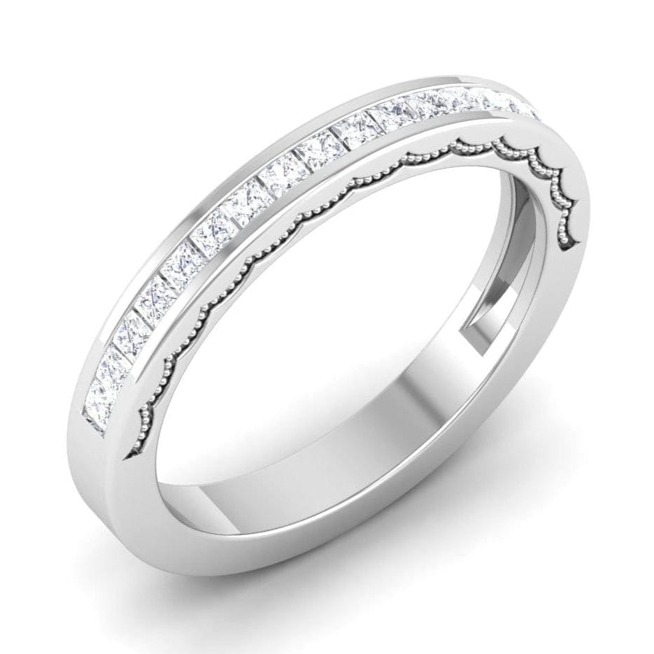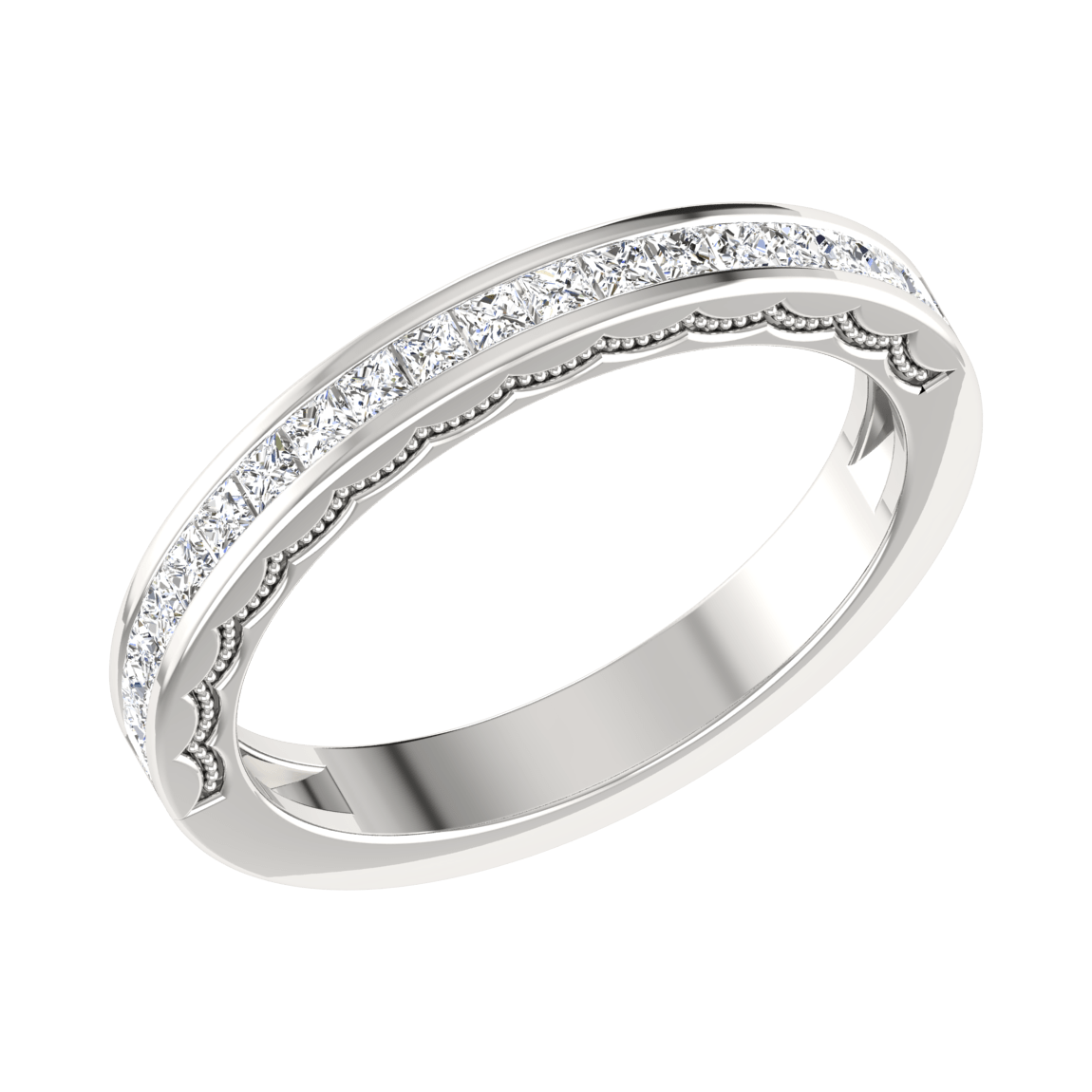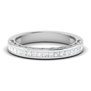 Dazzling princess cut diamonds studded in a row running across half the band, with platinum showing on both sides in a beautifully crafted channel setting band. The ring has a beautiful hidden milgrain finish that represents the inner strength of women.