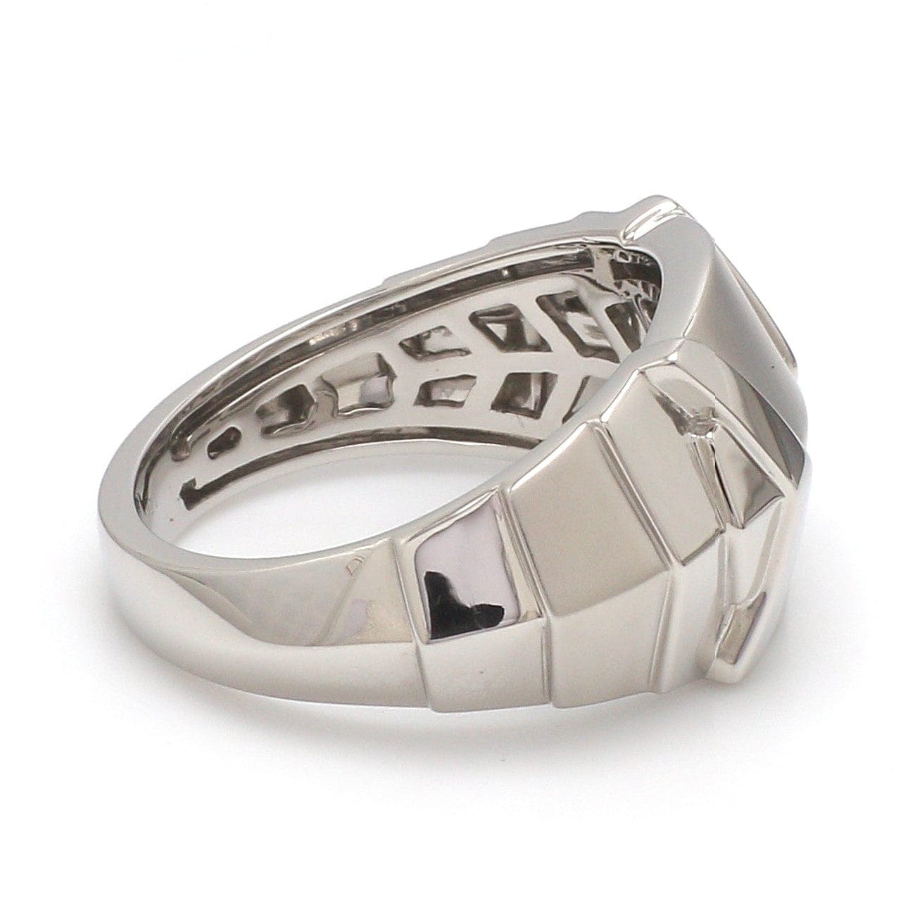 Samurai platinum ring for men with matte finish in the center with the sides in hi-polish. The greatest journey begins with a vision of tomorrow and these futuristic, aerodynamic pieces have been designed to be symbolic of just that. The grooves embedded on the inside stand for every step taken to overcome the odds in an extraordinary journey towards victory.