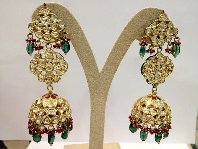 The Art of Kundan Meena by Jewelove Statement Kundan Meena Earrings by Jewelove. Magnificent handcrafted Jhumka pair studded with diamond polkis all around, with handcrafted enamel work done even on the inside of the domes, this pair of earrings define a class. On the top node the bottom katori inverted dome emerald hangings have been given to complete the grace of the royal Queen.